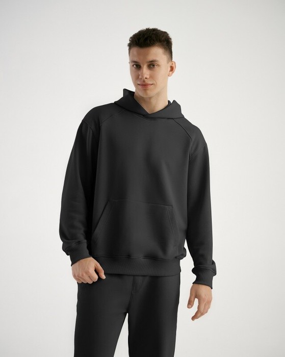Худи мужской свободного силуэта. Двойной капюшон с одним швом, притачные кокетки по переду, втачной рукав с локтевым швом. Карман "кенгуру".  Манжеты и пояс из кашкорсе