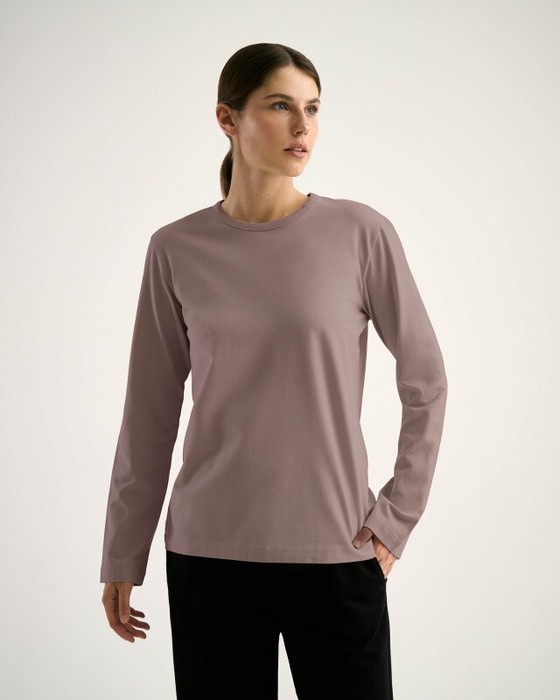 Лонгслив женский свободного силуэта. Втачной длинный рукав. Горовина окантована бейкой из основной ткани.