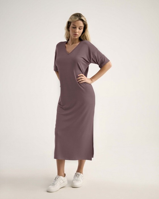 Платье, длина макси с высоким разрезом в левом боковом шве. Спущенное плечо.Втачной короткий рукав. V- вырез.Горловина окантована бейкой из основной ткани.