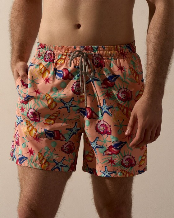 Плавательные шорты. Карманы в боковых швах. Задний карман с клапаном на правой задней половинке шорт. Пояс цельнокроенный, отстроченный, внутри с резинкой и шнурком.