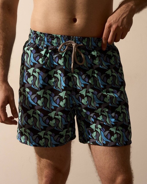 Плавательные шорты. Карманы в боковых швах. Задний карман с клапаном на правой задней половинке шорт. Пояс цельнокроенный, отстроченный, внутри с резинкой и шнурком.