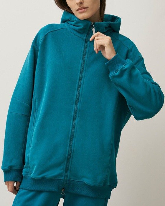 Толстовка на молнии, с отрезными кокетками. Двойной капюшон. Рукав втачной с вытачками по переднему шву. В рельефах переда карманы в шве. Манжеты и пояс из кашкорсе.