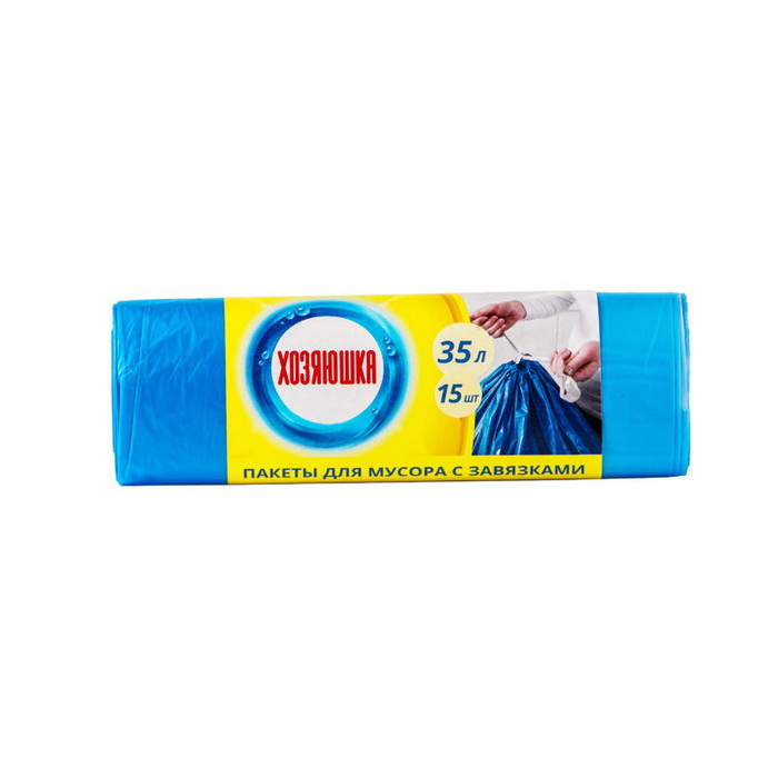 Пакеты для мусора Хозяюшка 35л синие 16 мкм с завязками ПНД 15шт.рул.