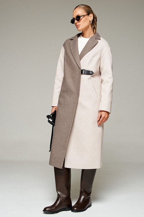 Пальто в актуальном сочетании меланжевых оттенков выполнено из шерстяной ткани, которая обеспечивает теплоизоляцию и защиту от ветра и влаги, подходит для межсезонья и теплой зимы. Двубортное, на подкладке. Изделие рассчитано на температурный режим от +10 до -5 градусов. Модель прямого силуэта с удлиненной линией плеча, предназначена для повседневного использования.
