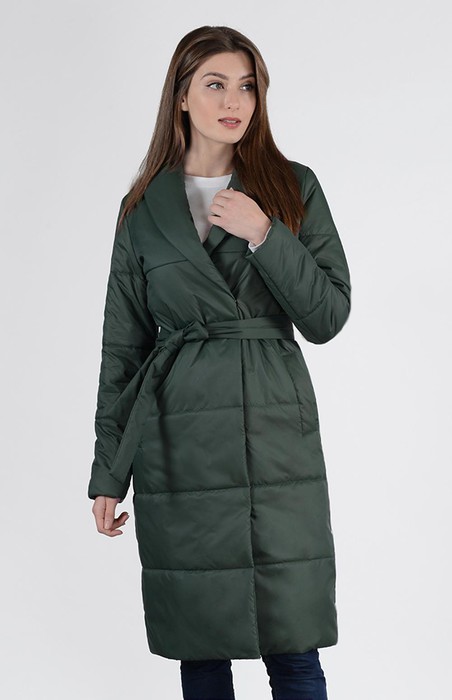 Стеганое женское пальто прямого силуэта с отложным воротником, застежка на потайные кнопки,карманы листочки и завязывающийся пояс придадут оброзу мягкость и женственность.Такая модель будет стильно смотреться как с любимыми джинсами и ботинками, так и платьями, обувью на каблуке. Длина по спинке -ок.106см, длина рукава-ок.63 см. Рост 170 см Р-ры: 42-52 Состав: полиэстер 100%, утеплитель: Air Twin Light 100 г/m 2 Цвет:зеленый Цвет одежды может незначительно отличаться от оригинала.