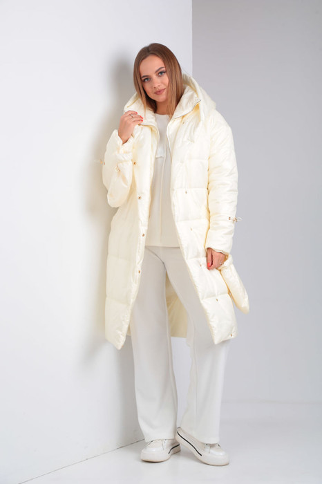 пальто женское с центральной застёжкой на кнопки. Линия плеча спущенная, рукав втачной одношовный с кулисой по низу. По переду прорезные карманы с листочкой с втачными краями. Капюшон цельнокроенный с центральной частью. В качестве отделки испоьзуются детали. Варежки съёмные манишка с центральной с центральной застёжкой на тесьму-молнию(втачная деталь).