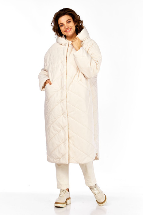 Пальто женское, прямого силуэта со смещенной застежкой на молнию (внутренняя) и кнопки. Линия плеча спущенная, рукав втачной одношовный. По переду карманы с личточкой. По спинке средний шов. Капюшон с центральной частью и отделочной деталью по отлету. В качестве отделки используется фурнитура и детали. Утеплитель- синтепон 150 гр.
