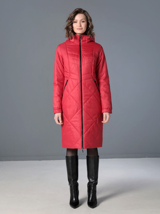 Пальто средней длины полуприлегающего силуэта с застежкой на двухзамковую молнию, обеспечивающую удобство при ходьбе.  Воротник - стойка, переходящая в регулируемый капюшон.  Удобно расположенные прорезные карманы застегиваются на молнию. Есть внутренний кармашек, тоже на молнии. Длину втачного рукава можно регулировать посредством отворота. При желании можно с помощью кулиски менять ширину изделия по линии низа. Модель такого пальто с контрастной фурнитурой и внутренней отделкой практична и подходит для девушек и женщин разных возрастных категорий. Плащевая ткань имеет водоотталкивающую пропитку,  выдержит небольшой осенний дождь. Хорошо зарекомендовавший себя утеплитель Холлофайбер плотностью 150 гр\м  защитит от холода и  ветра.