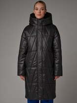 Пальто женское демисезонное, прямого силуэта однобортное, длина «миди», на подкладке. На переде карманы в рельефе, застежка потайная на петли и пуговицы. В нижней части среднего шва спинки шлица. Рукава двухшовные длинные, в локтевом шве отлетная шлица на 4 пуговицы и не пробивные петли. Воротник и лацкана отложные.