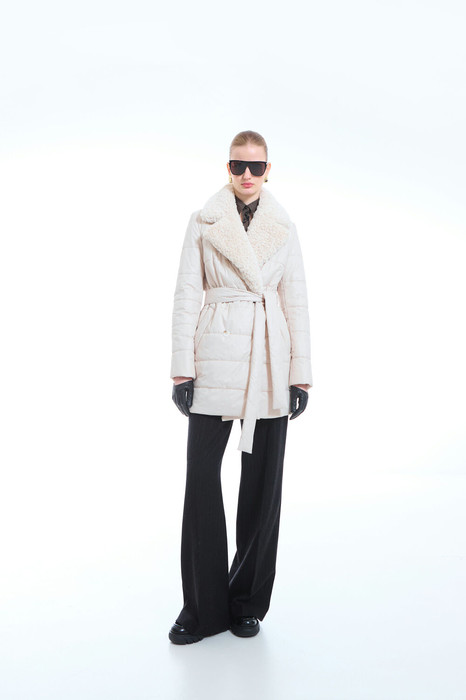 Пальто женское плащевое утепленное, стеганое на утеплителе ISOSFT 200 гр. Прямого силуэта, длиной выше колена, на подкладке. Воротник и лацкана из искусственного меха. Застежка на пуговицы. По переду карманы «листочка с втачными концами». Рукав длинный, двухшовный. Съемный пояс.