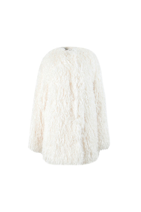 Пальто женское, однобортное, прямого силуэта, длиной до середины бедра. Застежка на пришивные кнопки. Перед с  карманами «щель». Рукав длинный, одношовный. Пальто из мехового трикотажного полотна, на подкладке.