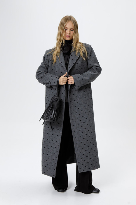 Пальто свободного силуэта из фактурной ткани с рисунком «ёлочка» и бантиками из флока.