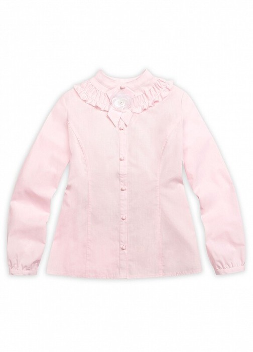 Блузка для девочек. Классическая блузка с длинным рукавом на узкой манжете. Воротник-стойка и декоративная сборка с рюшей в воротниковой зоне. Съёмный элемент в виде шикарной розочки из органзы на ленточке из основной ткани, крепится на пуговицу на планке.  Коллекция - школа.