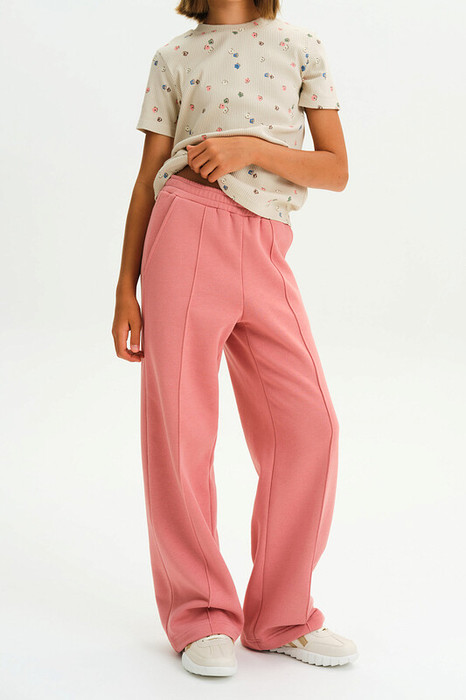 Брюки палаццо для девочки. Актуальные брюки свободного кроя подарят ребёнку комфорт и не будут стеснять движений. Широкая резинка в поясе не давит и не перекручивается. С помощью внутреннего шнура в поясе можно регулировать объём и посадку брюк. По переду застроченные стрелки — модный тренд сезона. По бокам глубокие наклонные карманы. Изделие лаконичного дизайна, без принта. Брюки неприхотливы в уходе. В составе ткани (футер с начёсом) преобладает качественный хлопок — штаны тёплые, мягкие и воздухопроницаемые, дают коже дышать. Благодаря полиэстеру изделие легко стирается, быстро сохнет и сохраняет первоначальную форму в течение долгого времени. Брюки детские выполнены в нескольких универсальных и трендовых цветах — они легко комбинируются с различными футболками, джемперами, толстовками, куртками. Палаццо брюки для девочек дошкольного и младшего школьного возраста, а также девочек-подростков. Брюки широкого кроя подходят для детского сада, прогулок, активного отдыха, спорта, а также для дома. Помните о правильном уходе за изделием: рекомендуется стирать при температуре не выше 30 °C, без предварительного замачивания, с изнанки. Это поможет сохранить качество и цвет брюк на длительное время.