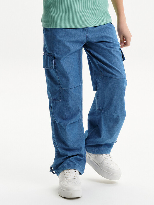 Хлопковые летние штаны трубы свободного кроя с накладными карманами с клапанами и прорезными боковыми карманами. На спинке справа накладной карман с клапаном. Для придания объема в области коленки на переде заложены складки - модный тренд. По переду имитация гульфика. Внутри пояса шнур для регулировки по талии. По низу штанов предусмотрена регулировка ширины с помощью эластика и стоппера. Штаны подходят под уличный стиль big boy.