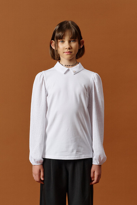 Эта трикотажная блузка для школы сочетает в себе удобство, аккуратный внешний вид и оригинальные детали. Модель выполнена из мягкого хлопкового материала с добавлением эластана — ткань дышит, приятно ощущается на теле и не сковывает движений. Полуприлегающий силуэт и эластичная структура делают блузку комфортной для повседневной носки в школе.