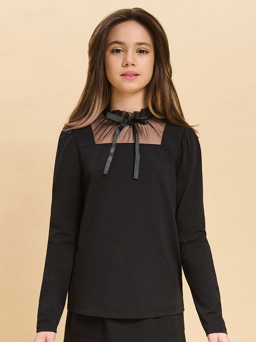 Джемпер с длинным рукавом, со сборкой по окату. Из мягкого хлопкового трикотажа с небольшим содержанием эластана, полуприлегающего силуэта с декоративной вставкой и рюшей по горловине из мягкой тонкой сетки. На горловину настрачивается репсовая лента, имитирующая миниатюрную стойку, на переде которой завязанный бант. По спинке застежка на пуговицу.