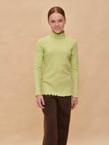Трикотажная блузка для девочек умеренного объёма, выполнена из эластичного хлопкового материала с коротким рукавом. Новым элементом в блузке является большой плосколежащий воротник фигурной формы, декорированный рюшей по внешнему краю, выполненный из отделочной швейной ткани. Удобство надевания изделия через голову обеспечивается спроектированной спереди планкой из швейного полотна с застежкой на пуговицы. Нижний край планки вшит в кокетку переда.  Сзади под воротником пришита узкая декоративная репсовая тесьма, которая завязывается спереди на бантик под воротником.