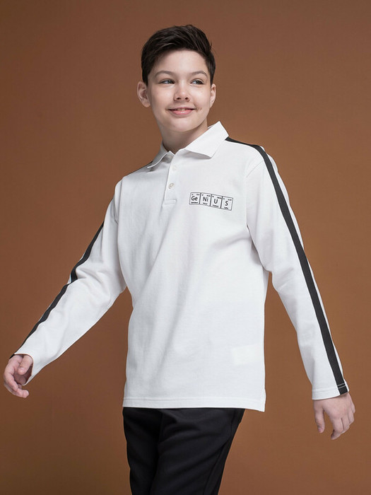 Джемпер-поло из 100% хлопка для мальчика. Натуральный состав ткани обеспечивает изделию мягкость, воздухопроницаемость и комфортность. Воротник из рибаны — долго не теряет форму и устойчив к частым стиркам. Модель декорирована лампасами вдоль плечевых швов и рукавов — один из актуальных трендов. На груди оригинальный силиконовый принт в виде элементов таблицы Менделеева, который устойчив к частым стиркам. Джемпер застёгивается на 3 пуговицы под горловиной — удобно надевать и снимать. Стильный вариант школьной формы для мальчиков.