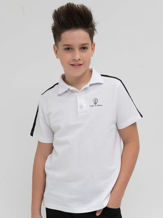 Белая футболка-поло из ткани-пике для мальчика. 100% хлопок в составе – ткань плотная, мягкая, дышащая, приятная на ощупь и простая в уходе. Воротник застегивается на три пуговицы. Изюминка модели – настроченная контрастная киперная лента по линии плеч. Сбоку – лаконичный принт с призывом сделать перерыв. Футболка подходит для создания спортивного стиля, а также для школьных будней – отлично сочетается с пиджаком и брюками.