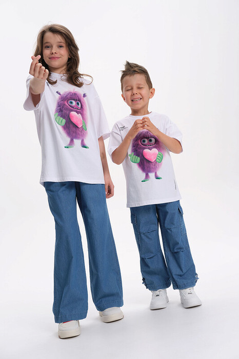 Детская футболка унисекс среднего объема. Прикольная нарядная футболка свободного силуэта со спущенным плечом не будет стеснять движений ребёнка. Вырез горловины отделан эластичной рибаной - голова не застрянет. Главная фишка футболки — яркий милый принт, изображающий персонажа, сгенерированного нейросетью (искусственным интеллектом). Это супермодный тренд! Принт эластичный и стойкий — без проблем переносит многочисленные стирки, не теряя своей яркости. На принте изображён забавный пушистый чудик (монстрик) фиолетового цвета с сердечком + надписи "к-сердце", "искры радости для меня" и "создано с помощью искусственного интеллекта". Широкая размерная сетка позволяет приобрести такую футболку как малышу в детский садик так и подростку. . Белые футболки подходят для носки летом, осенью и весной (демисезон), а также зимой .  Цвет товара на экране вашего устройства может отличаться от цвета изделия вживую.