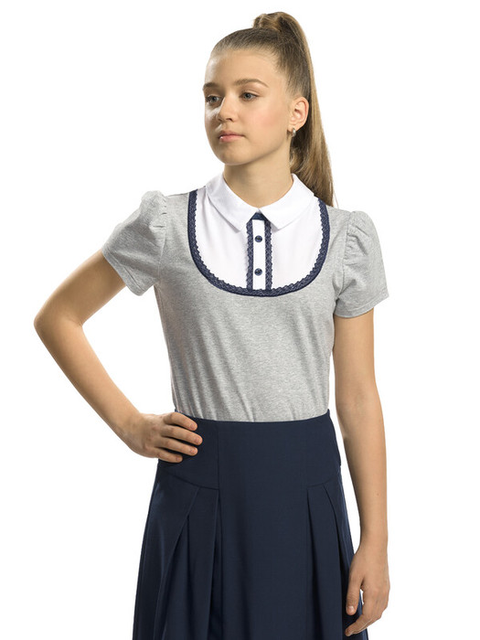 Актуальная футболка для девочек с трендовой имитацией на многослойность. Фирменный пелкановский трикотаж в двух практичных расцветках: темно-синий и серый меланж. Полукруглая кокетка и воротник-стойка создают иллюзию классической рубашки, что делает образ таким официальным. Сзади изделие застегивается на пуговицу, а благодаря чуть присборенным коротким рукавам, можно не переживать за комфорт и свободу движений маленькой непоседы.