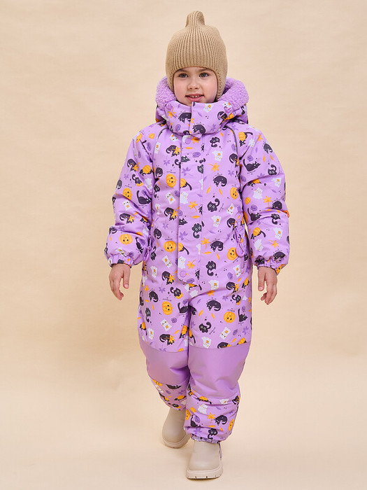 Комбинезон зимний детский из мембранной ткани для девочки. Модель свободного объёма с рукавами кроя реглан - ребёнку комфортно и не  стесняет  движения. На внешнюю поверхность материала нанесена водоотталкивающая пропитка (DWR), она задерживает грязь и влагу снаружи — ребёнок не промокнет от снега, а комбинезон легко отстирается. Также есть дополнительная пропитка на внутренней стороне ткани — для более надёжной защиты от промокания. Капюшон двухшовный, что обеспечивает анатомически правильную форму и комфортную посадку по голове. Капюшон не отстегивается, предусмотрена регулировка объема эластичными шнурами с пластиковыми стопперами. Внешний край капюшона декорирован мягким искусственным мехом, по текстуре напоминающим «барашка». Из этого же материала выполнена внутренняя подкладка капюшона, она комфортная, тактильно приятная. Удобная центральная застёжка на тракторную молнию. Тканевый стоппер защищает подбородок от зажима молнией. Фиксирующая строчка предохраняет планку от «заедания» в процессе застёгивания. Комбинезон тёплый — для оптимальной защиты от ветра и холода центральная молния дополнительно закрыта ветрозащитной планкой на кнопках и липучках (велькро). Спинка по талии присборена на внутреннюю резинку — комбинезон для девочки зимний безупречно садится по фигуре и не выглядит мешковато. Внутри комбинезона эластичные лямки — есть возможность снимать только верхнюю часть в помещении. Карманы с боковым входом закрываются на водонепроницаемую молнию со скрытыми звеньями — содержимое карманов не промокнет от снега во время активных игр на свежем воздухе. Внутри карманы утеплены мягким флисом. Замок дополнен тканевыми стопперами, что предохраняет его от разрыва. На пуллере эластичный запаянный шнур — ребёнку легко открывать и закрывать даже в варежках. Манжеты рукавов и брючин на комфортных широких резинках, это предохраняет от попадания внутрь снега. На муфтах брюк антискользящая резинка. Комбинезон дополнен съёмными силиконовыми штрипками. Область колен и нижняя часть спинки усилены более плотной тканью — можно смело кататься с горки и ползать на коленках сколько захочется. В каждом изделии нейм-лейбл! Ребёнок не потеряется и не потеряет комбинезон! Световозвращающие канты в проймах переда и спинки — безопасность в тёмное время суток. Модель красивого трендового цвета декорирована милым девичьим принтом. Комбинезон на молнии неприхотлив в уходе — ухаживать согласно указанным на вшивных ярлыках рекомендациям. Изделие выполнено из полиэстера с мембраной — оно не только защищает от холода и влаги, но и хорошо пропускает воздух, давая коже ребёнка дышать. Подкладка из мягкого, тёплого и дышащего флиса (по переду и спинке). В рукавах и штанинах подкладка из тонкого и гладкого полиэстера —  благодаря этому ребенку легко надевать комбинезон, руки и ноги не путаются в рукавах и штанинах, а легко проскальзывают. Зимний комбинезон детский идеален для маленьких девочек дошкольного и младшего школьного возраста. Рекомендуемый температурный режим: не ниже минус 25 градусов. В изделии использован один из высокотехнологичных утеплителей — феллекс 260 г/м2. Дышащие свойства мембраны: не менее 3000 г/м2/сут. — ребёнку будет комфортно на прогулке. Модель подходит для носки в детский сад, для прогулок и отд