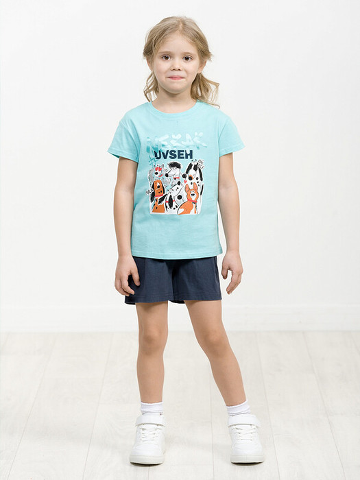 Комплект для девочек футболка и шорты. Футболка силуэта оверсайз. Rubber принт собаки стикерпак с обилием серебряного и бирюзового металликов. Шорты свободного силуэта с защипами спереди и регулировкой объема шнуром.