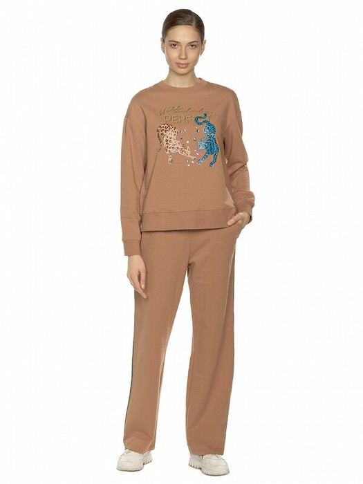 Комплект женский свитшот и брюки. Свободный расслабленный объем. Укорочённый свитшот со стильными широкими манжетами из рибаны. Суперстойкий центральный моно принт с добавлением золота и цветных термостраз. Шрифтовой rubber принт выполнен золотым металликом. Перевод Что ж, никто не совершенен. Прямые свободные брюки с контрастными трикотажными лампасами с люрексом. Карманы в боковых швах.