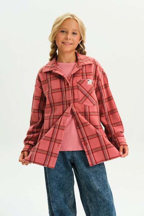 Эта флисовая рубашка для девочки — идеальный выбор для прохладных дней. Модель умеренного объёма с отложным воротником создаёт аккуратный и стильный образ.