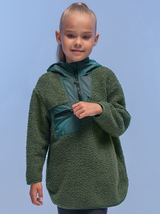 Худи детское для девочки. Туника выполнена в сочетании двух материалов: бербер-флиса с мягкой фактурой «барашка» и гладкой курточной ткани. Это супермодный тренд. Капюшон, отделка горловины и карман на груди — из курточной ткани — максимум практичности. Ребёнок не промокнет, а карман не будет мараться при частом использовании. Худи для девочек актуального оверсайз-силуэта со спущенным плечом подарит ребёнку комфорт и не будет стеснять его движений. Высокий воротник защищает шею от холода и ветра. По низу изделия и низу рукавов окантовка эластичной тесьмой —они не растягиваются и сохраняют форму и прекрасный внешний вид надолго. Справа на груди накладной карман на молнии — можно спрятать телефон. В боковых швах также есть карманы — удобно пользоваться. Капюшон двухшовный, это обеспечивает анатомически правильную форму и комфортную посадку по голове. Объём капюшона регулируется тесьмой, внутри подкладка из мягкого флиса. Двойной капюшон - швы закрыты, смотрится аккуратно. По переду застёжка на короткую молнию — один из супер-трендов сезона. Худи однотонное, без принта. Неприхотливо в уходе. Одежда из флиса тёплая, лёгкая, мягкая, просто стирается и быстро сохнет, не скатывается, сохраняет первозданную форму в течение длительного времени. Вставки выполнены из ткани, в составе которой нейлон и полиэстер, они прочные, не выгорают и не растягиваются. Худи выполнено в зелёном цвете (трендовый оттенок хаки). В линейке представлены следующие размеры: 2 (92); 3 (98); 4 (104); 5 (110); 6 (116); 7 (122); 8 (128); 9 (134); 10 (140); 11 (146). Худи утеплённое подходит для девочек дошкольного и младшего школьного возраста, а также девочек-подростков. Его можно носить в детский сад, на прогулки, отдых, а также дома. Худи с капюшоном идеально для круглогодичной носки: прохладным летом, осенью и весной (демисезон), зимой. Замечательный подарок дочери, внучке или сестре на День рождения и любой другой праздник.