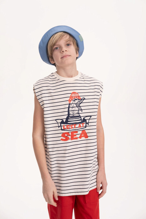 Летняя майка для мальчика свободного силуэта. Выполнена из 100% хлопка. Горловина из рибаны - голова не застрянет. Тельняшка без рукавов по переду украшена принтом с надписью. Перевод надписи: "lost in the sea" - затерянный в море. майка в полоску отлично подойдет для занятий спортом, походов на пляж и прогулок.