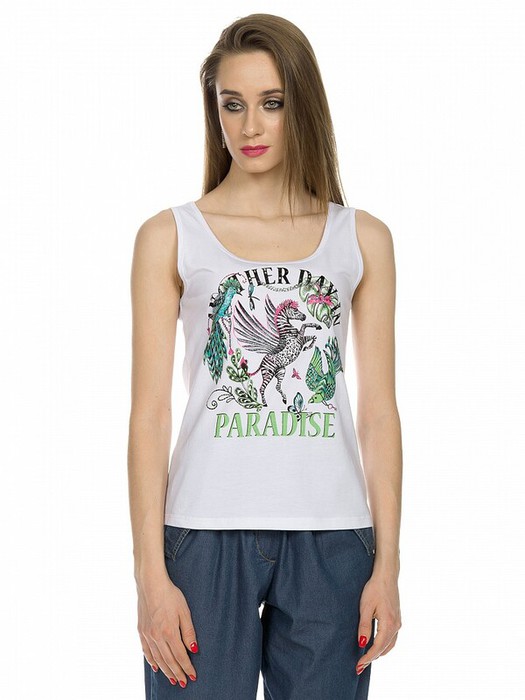 Майка женская. Майка небольшого объема с красивой линией горловины, напоминающей каре. Стойкий и мягкий принт выполнен с добавлением неоновых красок, глиттера и глянца в шрифте, декорирован стразами. Перевод Еще один день в раю.