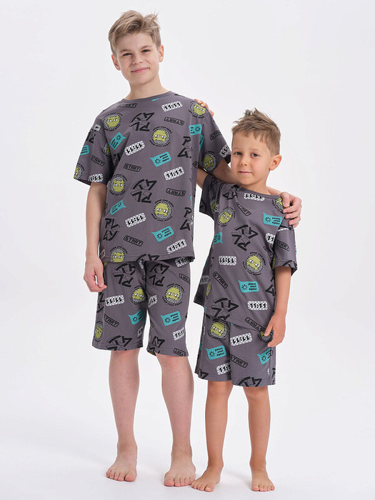 Стильная и уютная пижама для мальчика. В составе ткани 100% хлопка — идеально для детской одежды! Модель приятна на ощупь, прекрасно пропускает воздух, позволяя коже ребёнка дышать. При этом в пижаме из хлопка ребёнку будет уютно, даже если он сбросит одеяло. Всё это обеспечивает комфортный и качественный сон. Футболка и  удлиненные шорты, плечо спущено, рукава широкие и свободные — пижама на мальчика очень удобна для сна. Широкая и мягкая резинка в поясе не перекручивается и не давит. Отделка горловины из эластичной рибаны — она не растягивается, ребёнку удобно надевать и снимать пижаму. Перевод надписей: "создай себе настроение", "создай своего игрока", "творец", "игра". Хлопковый комплект идеален для сна и отдыха дома — прекрасный выбор для вашего ребёнка! Пижама с шортами для мальчика подходит для круглогодичного использования. Домашний комплект — замечательный подарок сыну, внуку, брату на любой праздник. Выбирайте нужный размер по таблице размеров на фото. Цвет товара на экране вашего устройства может отличаться от цвета изделия вживую.
