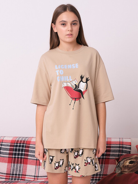 Пижама женская с шортами. В составе ткани преобладает высококачественный хлопок — домашняя пижама мягкая, гипоаллергенная и хорошо пропускает воздух. В пижаме вам будет комфортно и уютно во время сна. Эластан помогает модели надолго сохранить первоначальную форму. Футболка свободная, плечо спущено, рукава широкие — в пижаме очень удобно спать. В поясе шорт мягкая и широкая резинка — не перекручивается и не давит. Отделка горловины из эластичной рибаны — она не растягивается, пижаму удобно надевать и снимать. Костюм домашний женский украшен прикольным принтом, надпись переводится: «лецензия на чилл» — поймайте позитивное настроение! Домашний комплект с шортами неприхотлив в уходе. Принты эластичные и прочные, без проблем переносит частые стирки. Помните о правильном уходе за изделием: рекомендуется стирать при температуре не выше 30 °C, без предварительного замачивания, с изнанки. Это поможет сохранить качество и цвет пижамы на длительное время.