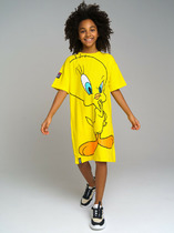 Платье для девочек из футера свободного силуэта со слегка спущенным плечом, зауженное книзу, боковые швы переведены на перед, перепад длины переда и спинки, рукав умеренного объема, горловина и манжеты рукавов из рибаны с люрексом. Мягкий эластичный принт с серебряным блеском. Перевод Позволь своему сердцу петь и Музыка сердца.