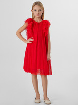 Платье для девочек. Новинка. Платье из трикотажа А-образного силуэта с открытыми плечами и рукавами воланами. По всей линии груди проходит декоративная трикотажная лента, которая спереди формирует угол. Принт в виде птички колибри и надписи с разноцветным глиттером, перевод Новая атмосфера . Платье имитирует многослойность полосатый топ и сарафан.