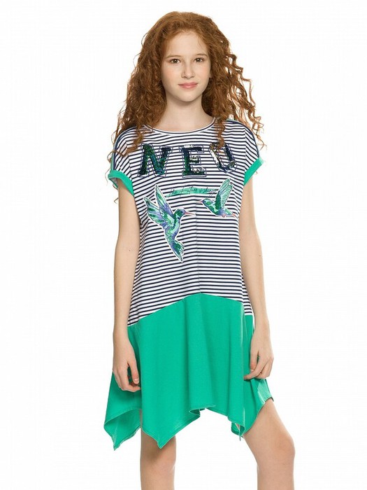 Платье для девочек. Новинка. Платье из хлопкового трикотажа силуэта оверсайз, с полукруглым членением по линии бедер и фигурной угловатой линией низа. Спущенное плечо с притачной закрепленной манжетой. Вдоль линии плеч настрочена декоративная трикотажная тесьма. По переду изделия принт с разноцветным глиттером в виде птичек колибри  и надписи, перевод  Блестящее будущее , и вышивка из переливающихся переворачивающихся пайеток.