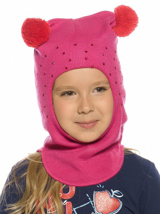 Новинка! Зимняя шапка - шлем для девочек, зона ушей и лба утеплена синтепоном, перепад длины переда и спинки, по переду изделия декоративные стразы, помпоны контрастного цвета