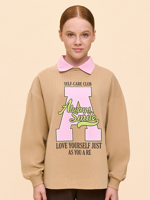 Свитшот детский для девочки свободного силуэта со спущенным плечом. Объёмный джемпер оверсайз  — отличный выбор для детского повседневного гардероба. Манжеты выполнены из эластичной рибаны (ткани в рубчик). Она не растягивается, отлично сохраняет форму, при этом ребёнку удобно надевать и снимать свитшот. Модель неприхотлива в уходе. Свитшот с принтом по переду выполнен из хлопкового футера — он мягкий, дышащий и комфортный. Эластан в составе ткани обеспечивает изделию долговечность. Принт в трендовом университетском стиле мягкий и эластичный, без проблем переносит многочисленные стирки. Надписи переводятся: «клуб любви к себе», «люби себя таким, какой ты есть», «улыбайся всегда».  Фишка модели — оригинальный воротничок из рибаны. Создаётся иллюзия, что под свитшотом надето поло — модный эффект многослойности. Детский свитшот выполнен в в универсальном девичьем цвете, который легко сочетать с любыми брюками, джинсами, юбками. Свитшот с воротником подходит как для маленьких девочек, так и для девочек-подростков. Джемпер идеален для детского сада, прогулок, активного отдыха, дома. Оверсайз свитшот можно носить круглый год. Помните о правильном уходе за изделием: рекомендуется стирать при температуре не выше 30 °C, без предварительного замачивания, с изнанки. Это поможет сохранить качество и цвет свитшота на длительное время.