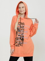 Удлиненное худи мангового цвета большого объема с эластичным принтом с глянцем. Манжеты по низу рукава и низу изделия из рибаны. Объем капюшона регулируется шнурком черного цвета. Перевод Мои намерения на сегодня расслабиться, освежиться, перезагрузиться и быть свободной.