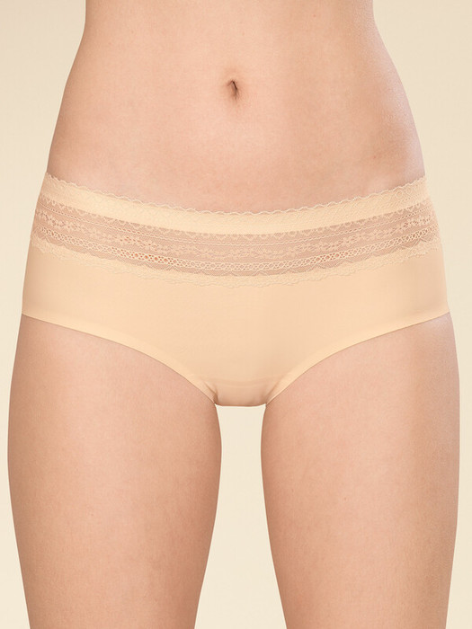 Женские трусы-шорты с низкой посадкой. Изготовлены по бесшовной технологии с минимум швов. Кромки по ноге и по талии подогнуты и приклеены, хлопковая приклеенная ластовица.  Нежное геометричное кружево по линии талии высотой 5 см – не передавливает тело и не натирает кожу.  Модель оценят те, кто ищет незаметное и невесомое белье на каждый день или особого случая.