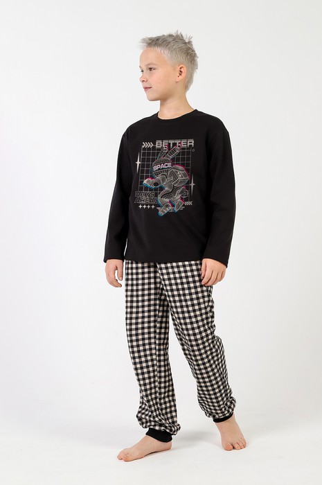 Пижама для мальчика, состоящая из футболки и брюк. Футболка - из гладкокрашеного трикотажного полотна "кулирка", классического покроя: с длинными втачными рукавами, горловиной овальной формы, обработанной втачной планкой и принтом в центре переда, выполненным в технике шелкографии. Брюки - из трикотажного полотна "кулирка" в клетку, длинные, с эластичной тесьмой на поясе и притачными манжетами из полотна "кашкорсе" черного цвета.