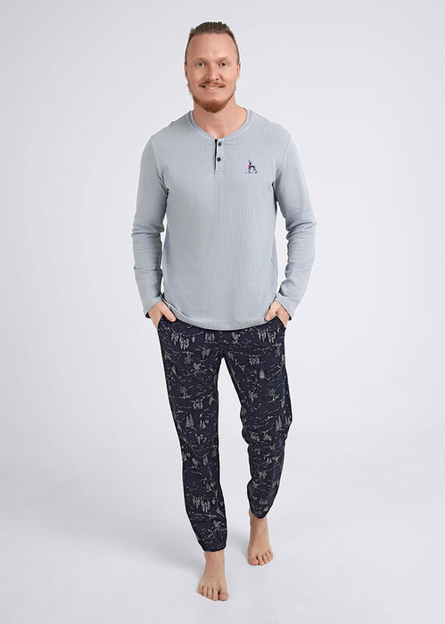 Комплект мужской для дома состоящий из джемпера и брюк. Джемпер из трикотажного полотна с функциональной планкой на пуговицы, стильной вышивкой. Брюки из плотного трикотажного полотна в набивку на эластичном поясе, карманами и шнуром.