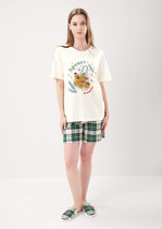 Пижама молодежная из трикотажного полотна «кулирка» с набивным рисунком, состоящая из майки - топа и шорт. Майка-топ – слегка расширенная книзу, на узких бретелях, вытачанных из окантовки. Для регулирования длины бретелей предусмотрены пластмассовые кольца-держатели и фиксаторы. По центру переда застрочен «защип» и пришиты три декоративные пуговицы имитирующие застежку. Вырез горловины переда, спинки отделаны кружевом.Брюки – полуприлегающие, с эластичной тесьмой по талии и нижними срезами отделанными узким кружевом.