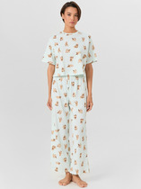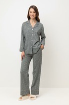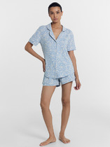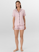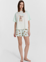 "Костюм-пижама для беременных и кормящих женщин. Футболка с V-образной горловиной, короткими рукавами, со сборкой на резинку спереди, под грудью. Шорты с уменьшенной высотой спереди для их комфортного расположения под животом, расширенные книзу.