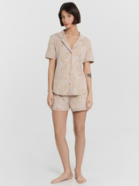 Женская пижама с трендовым принтом: классическая футболка с коротким рукавом и круглым вырезом, а также прямые брюки с карманами и поясом на резинке.