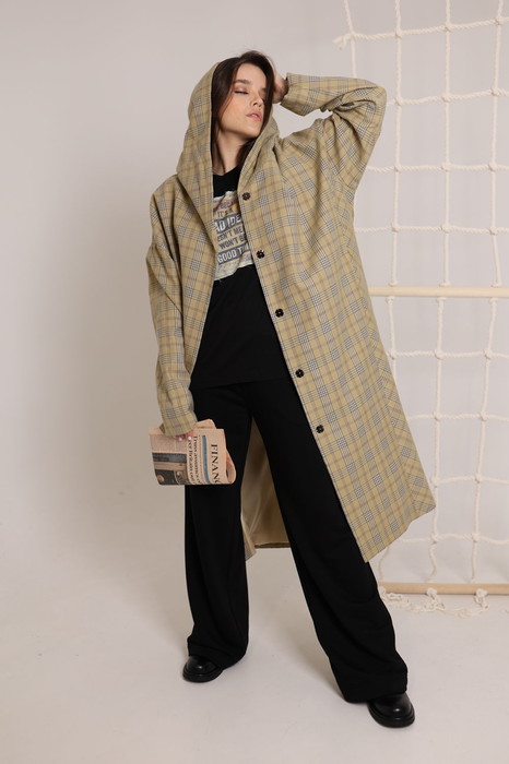 Неверояно стильный кардиган из натуральной ткани в клетку. Капюшон,карманы, застежка на пуговицы, сьемный пояс и….. Шарм..