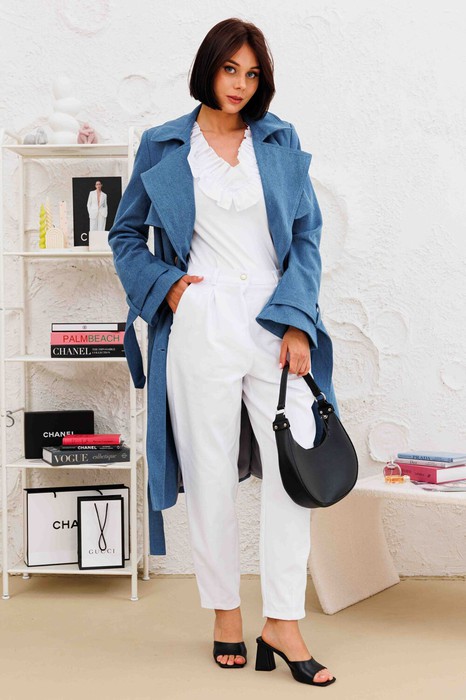 Тренч выполнен из денима, на подкладке. Рукав втачной, к низу расклешенный.  По переднем половинкам обработана пелерина. Застежка на  пуговицы, сьёмный пояс из основной ткани.