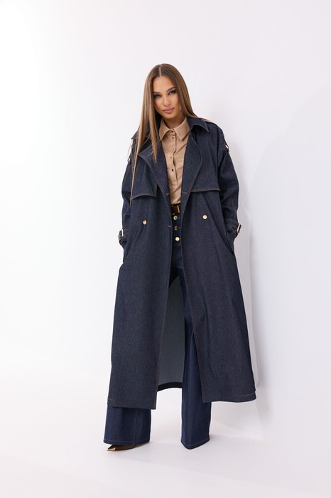 Плащ свободной формы из джинсовой ткани. Длина макси. Застёжка двубортная на петли и пуговицы-болты. По переду и спинке отлетные кокетки. Спинка с высокой шлицей. Воротник стояче-отложной. По переду прорезной карман с клапаном на петлю и пуговицу-болт. Рукав-реглан прямой с погоном на петлю и пуговицу-болт. По низу рукава регулируемая пата с пряжкой. В комплекте съёмный завязывающийся пояс.